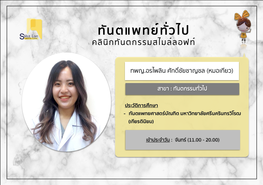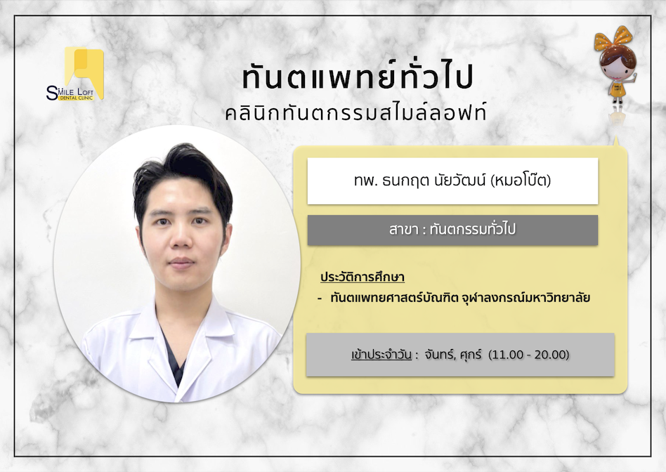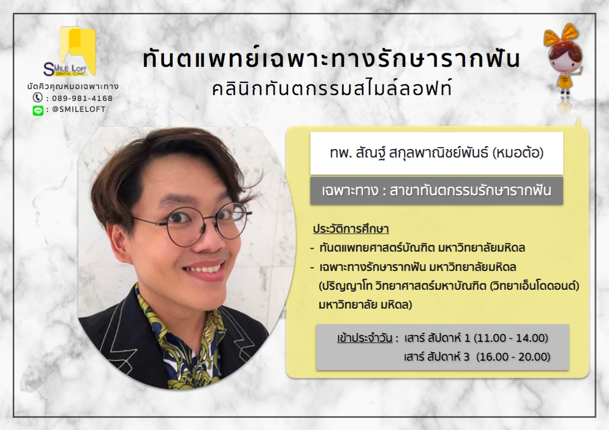 ทีมทันตแพทย์ Dentists Orthodontist ทันตแพทย์เฉพาะทางจัดฟัน สมาคมทันตแพทย์จัดฟันแห่งประเทศไทย สาขาอนุสาวรีย์ชัย หมอเมย์ หมอตั้ม หมอนิ่ม หมอปลาย หมออ๊อฟ หมอเอิร์ธ หมอปิง หมอลุค หมอเอ็ม หมอโม สาขาปิ่นเกล้า หมอลุค หมอเอ็ม หมอแมน หมอนิ้ง หมอบี หมอผิง Operative dentist ทันตแพทย์เฉพาะทางทันตกรรมหัตถการและความสวยงาม สาขาอนุสาวรีย์ชัย หมอโอ หมอเอ้ย Endodontist ทันตแพทย์เฉพาะทางรักษารากฟัน หมอต้อ หมอต๋า Prosthodontist ทันตแพทย์เฉพาะทางฟันปลอม หมอทิพย์ Oral & maxillofacial surgeon ทันตแพทย์เฉพาะทางศัลยศาสตร์ช่องปาก สาขาอนุสาวรีย์ชัย หมอโบว์ หมอกิตต์ สาขาปิ่นเกล้า หมอนุ๊ก Periodontist ทันตแพทย์เฉพาะทางโรคเหงือกและปริทันตวิทยา สาขาอนุสาวรีย์ชัย หมอนอร์ท General dentist ทันตแพทย์สาขาทันตกรรมทั่วไป สาขาอนุสาวรีย์ชัย หมอโบ๊ต หมอกิล หมอเกียว สาขาปิ่นเกล้า หมอป้อป หมอฟาง หมอเกียว Occlusion specialist ทันตแพทย์เฉพาะทางทันตกรรมบดเคี้ยวและข้อต่อขากรรไกร หมอปิง ตารางทันตแพทย์ประจำเดือน Dentist schedule สาขาอนุสาวรีย์ชัย สาขาปิ่นเกล้า นัดปรึกษาทันตแพทย์ Appointment for consultation หน้าแรกของเรา HOME โปรโมชั่นใหม่ล่าสุด Hot Promotions เคสรีวิว our reviews สาระน่ารู้เรื่องฟัน Articles ภาพบรรยากาศคลินิก our galleries บริการของเรา Our services FacebookFacebookXXLINELine